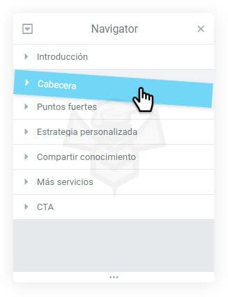 El Navegador de elementor o Navigator (como se le nombra en Elementor ya que aún no ha sido traducido) es un panel que muestra un árbol jerárquico de navegación con todos los elementos (secciones, columnas y widgets) que componen el documento activo y que proporciona un fácil acceso a todos ellos con un solo clic.