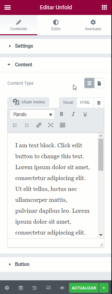 Puedes personalizar el botón que pliega y despliega el bloque de contenido oculto en la sección Button (botón).